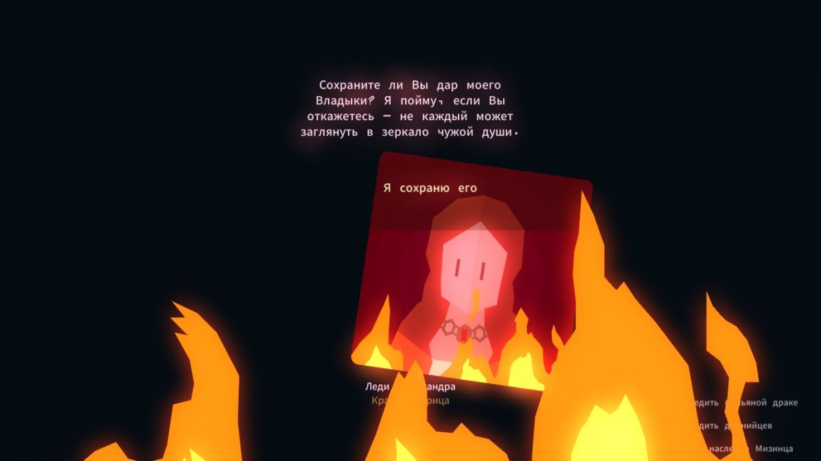Игры серии Regins - это игровые проекты, в которых вам предстоит побывать в роли монарха, принимая сложные решения. Игра будет подавать вам разнообразные ситуации в формате текста и картинок, которые изображены на картинке, а вы, как мудрый король, отвечаете односложно: "Да" или "Нет". Звучит невероятно скучно, но поверьте - смотреть на то, как ваши решения влияют на жизнь целого королевства интереснее, чем монотонно кормить коров на ферме в какой-то посредственной стратегии. Да, у Reigns Game of Thrones нет тысяч юнитов, серьезных ачивок, зрелищных битва, но в ней есть душа. Геймплей у игры простой: нужно просто свайпать вправо или влево, принимая решения - все. Главная задача монарха - продержаться на троне до победного конца, дожив до собственной смерти в постели. Сразу хотим предостеречь, что получится это далеко не у всех - победа в Reigns Game of Thrones приходит только к самым усидчивым и думающим игрокам. События у игры, скорее всего, происходят после конца седьмого сезона, хотя это только догадки, ведь об этом нигде не говорится. В начальной заставки Reigns Game of Thrones Красная Ведьма вглядывается в пламя, а после этого резко начинается игровой процесс.